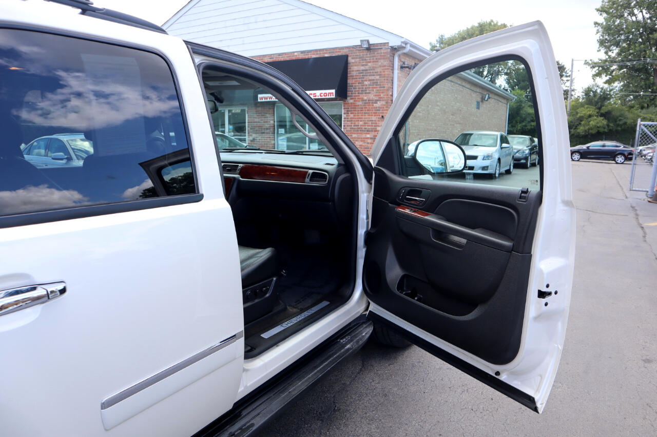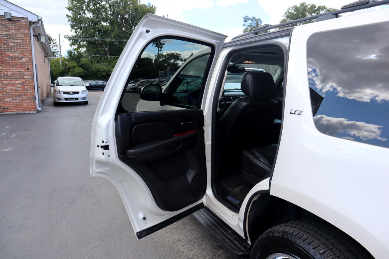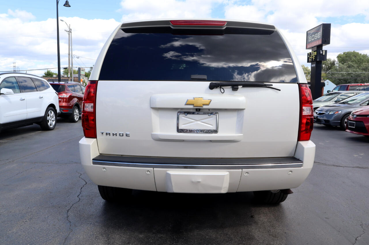 Clean CARFAX. White Diamond Tricoat 2014 Chevrolet Tahoe LTZ 4WD 6-Speed Automatic Electronic with Overdrive Vortec 5.3L V8 SFI Flex Fuel Iron Block 4WD, Ebony w/Custom Perforated Leather-Appointed Seat Trim.