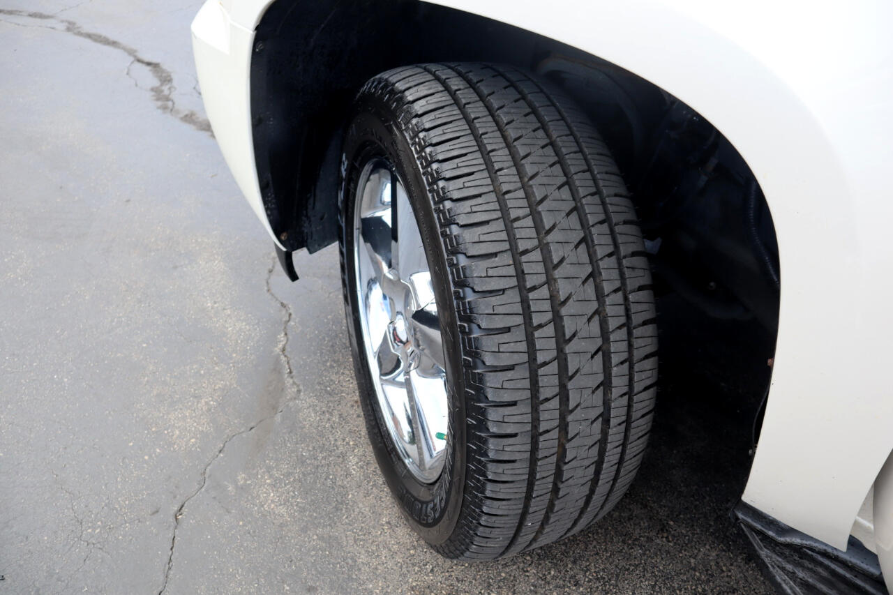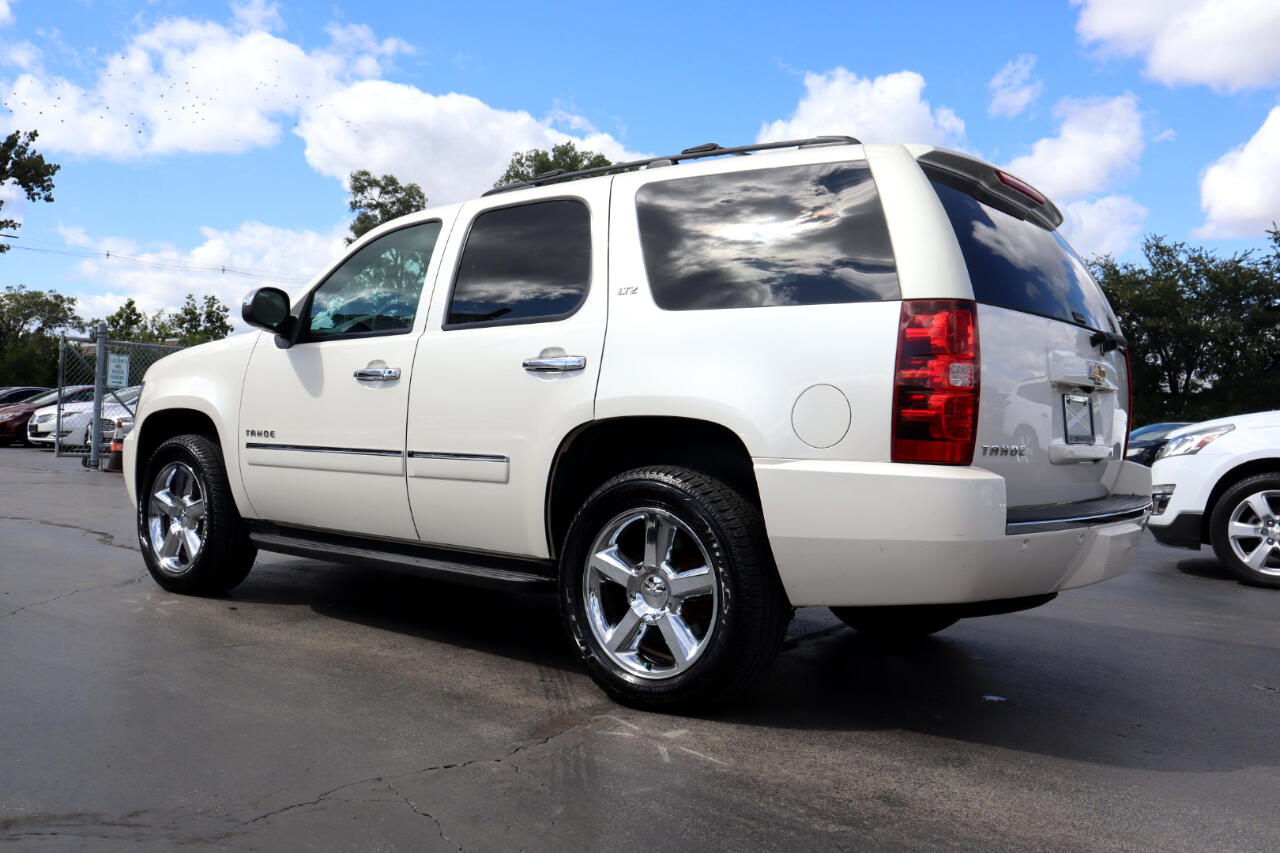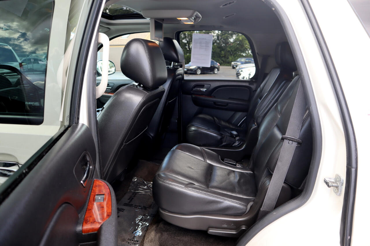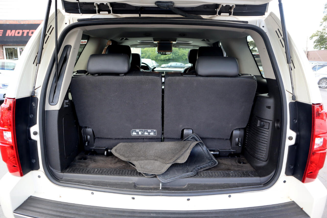 Clean CARFAX. White Diamond Tricoat 2014 Chevrolet Tahoe LTZ 4WD 6-Speed Automatic Electronic with Overdrive Vortec 5.3L V8 SFI Flex Fuel Iron Block 4WD, Ebony w/Custom Perforated Leather-Appointed Seat Trim.